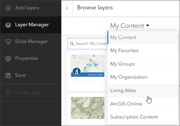 Step 3: Go to the Browse layers drop-down and choose Living Atlas.