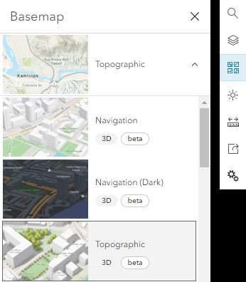 Step 5: From the light toolbar, click the Basemap tool, then click the drop-down menu. Different basemaps will add different labels. The Enhanced Contrast basemap, for example, will add draped reference layer labels to the scene. For this tip, choose Topographic (3D) to add 3D Places and Labels.