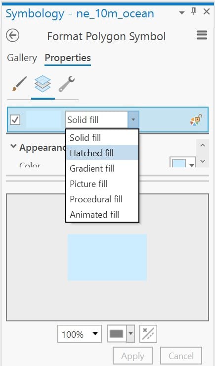 Step 4: Select Hatched fill from the drop-down menu, then click Apply. This gives the layer a striped effect.