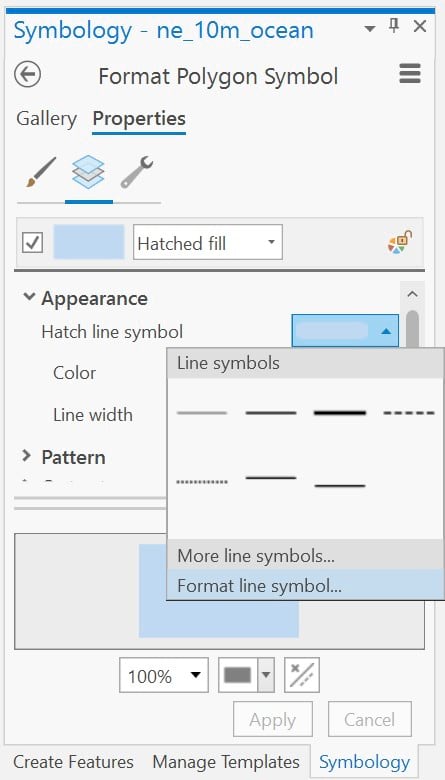 Step 8: Under Appearance, click the drop-down menu beside Hatch line symbol, then select Format line symbol from the bottom of the menu. Here, you can alter the line shape.
