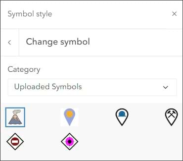When styling point symbols in ArcGIS Online, you’ll find many to choose from. Built-in symbols are organized into categories for easy browsing and selection. In addition to the built-in symbols, you can upload and use any PNG or JPG image to add your own symbols to your maps for a unique look and feel. These are part of the uploaded symbols category, and can differentiate your work from others or provide focus to the content you want to present.