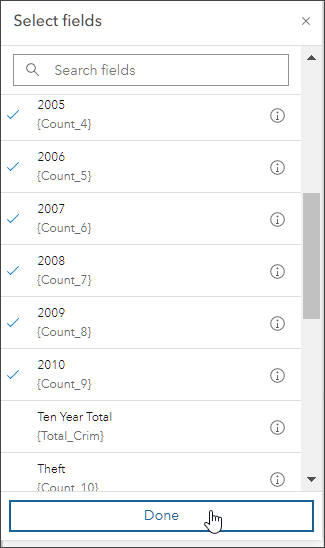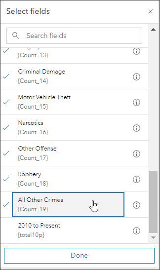 Step 14: Select the fields that total the types of crimes: Theft, Assault, Battery, Burglary, Criminal Damage, Motor Vehicle Theft, Narcotics, Other Offense, Robbery, and All Other Crimes. Make sure to select All Other Crimes. Click Done when finished.