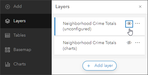 Step 2: Open the Layers pane in the Contents (dark) toolbar. Hide the Neighborhood Crime Totals (charts) layer, and show the Neighborhood Crime Totals (unconfigured) layer.