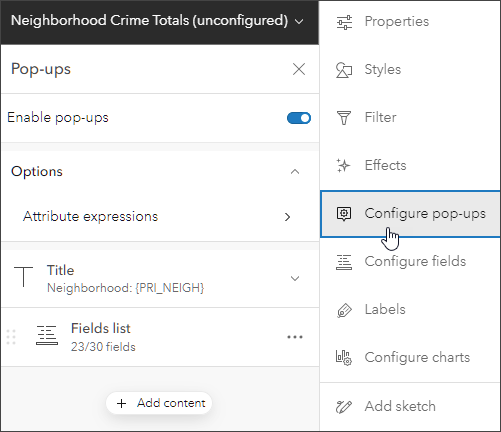 Step 3: Ensure that the unconfigured layer is selected. In the Settings (light) toolbar, click Configure pop-ups.