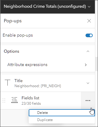 In this tip, you will learn how to add and configure bar, line, and pie charts in pop-ups. Open the completed sample map to view the configured pop-up charts. The map contains an unconfigured layer you can use to follow along in this tutorial, plus a layer configured with the charts described below. Click any feature to view the bar, line, and pie charts. The sample data focuses on crime statistics by neighborhood.