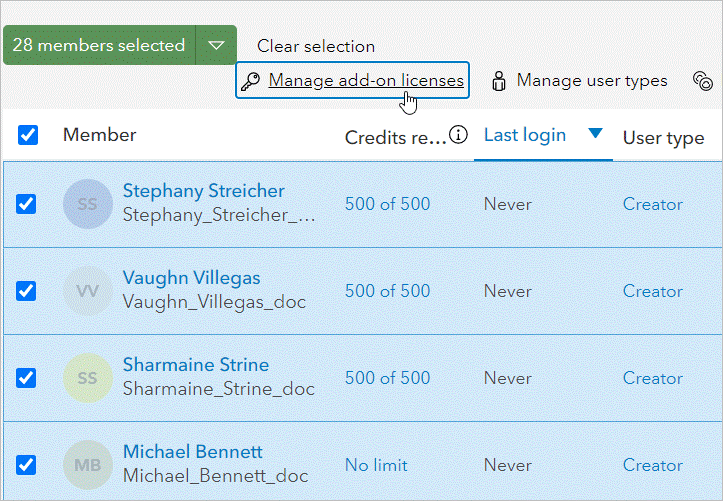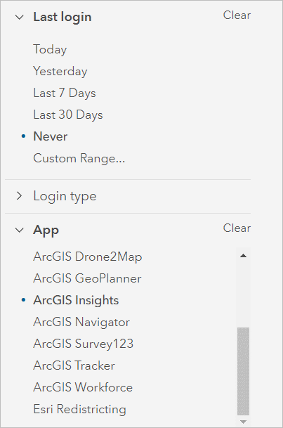 Step 1: Expand Last login and click Never to filter the list to show members who have never signed in. Then, expand the App filter and select the add-on app you want to reassign, such as ArcGIS Insights.