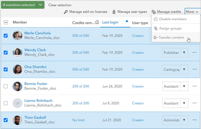 As members come and go—or change roles, departments, or teams—some cleanup is required to free up or reassign resources like app licenses. For example, your organization may have inactive members who you’ve discovered don’t work with ArcGIS Online, and you need to make their app licenses available for other members to use.