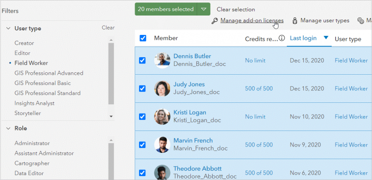 The Members tab on the Organization page provides a central location for managing members. Whether you need to assign add-on app licenses, add members to groups, or perform any other member management task, ArcGIS Online includes time-saving capabilities such as filters and bulk actions to help you get the job done.