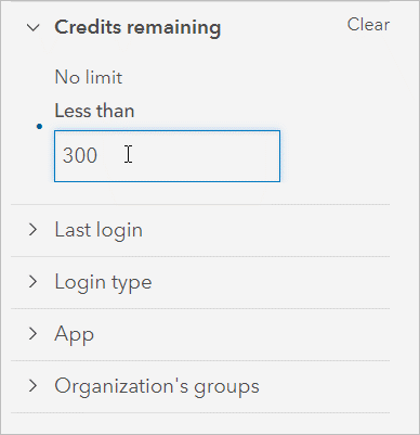 Step 2: Expand the Credits remaining filter. You want to find members who have fewer than 300 credits remaining so you can increase them to 500 credits. Under Less than, type 300 and press Enter to filter the members list.