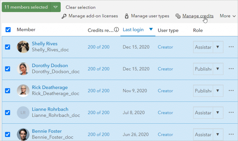 As members of your organization complete their daily work in ArcGIS Online, the number of credits allocated to them may become low. Before you start receiving a slew of email requests for more credits, you can proactively update the credit allocation for members who are running low.