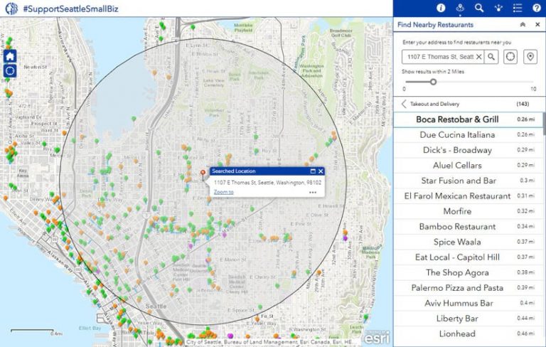 The City of Seattle’s Information Technology department used ArcGIS Online to create this mapping application to help restaurateurs and other food and beverage entrepreneurs promote awareness that their businesses are still serving with social distancing guidelines in place.
