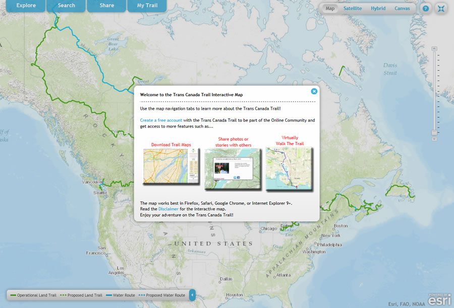 Today, four out of five Canadians live within 30 minutes of the Trans Canada Trail, and tens of thousands get out on the trail network to stay fit, see the wildlife, and visit historic sites and scenic areas. The online mapping application from Esri Canada contains interactive features that can help them plan runs, hikes, bike trips, horseback and snowmobile rides, and cross-country ski trips.
