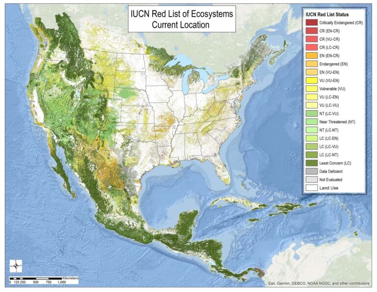 NatureServe used ArcGIS Pro, in combination with other GIS software, to implement the RLE standard, modeling both declining and restricted ecosystem distributions in temperate and tropical North America. Once assessed, the ecosystem types were categorized as Vulnerable, Endangered, Critically Endangered, Near Threatened, Least Concern, Data Deficient, and Not Evaluated.