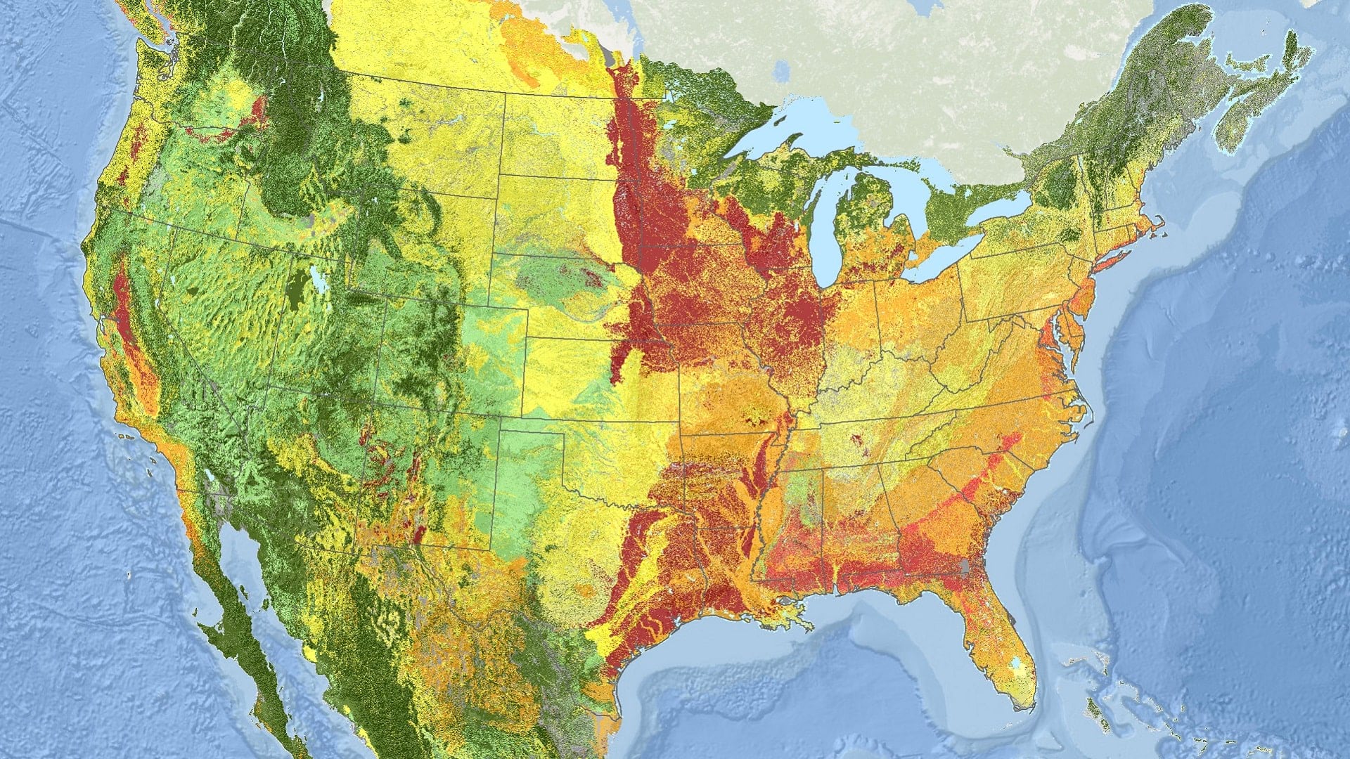 The most critically endangered ecosystems in the US are concentrated in the Midwest, Lower Mississippi Valley, Gulf Coastal Plain, and California’s Central Valley, where large proportions of forests were cleared, grasslands were plowed, or large wetlands were drained for intensive land uses like agriculture and rangeland for livestock.