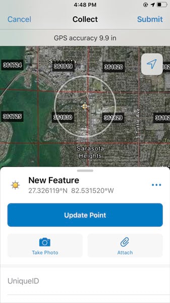 For GPS receivers, Rockwell contacted the city’s GPS vendor for a recommendation. The vendor expedited a shipment of 14 Arrow 100 GNSS receivers, manufactured by Esri partner Eos Positioning Systems. The Arrow 100 connects seamlessly with ArcGIS Collector on iOS to provide submeter accuracy and performs uniquely well even under the dense tree canopy in Sarasota.
