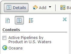 Step 6: Return to the toolbar and click Details and Contents again. Check the Active Pipelines by Product in U.S. Waters check box, which turns the pipelines layer back on. Click the arrow that appears when you hover over U.S. Fishery Management Plans. Then click Move Down to put the fishery management area polygons below the pipeline line features, enhancing the web map’s clarity. This is what you should see: