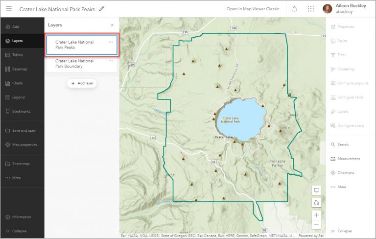 This opens a map with two layers: Crater Lake National Park Boundary and Crater Lake National Park Peaks, which were clipped from the original source, USA Mountain Peaks, in the Esri Data & Maps group in ArcGIS Online.
