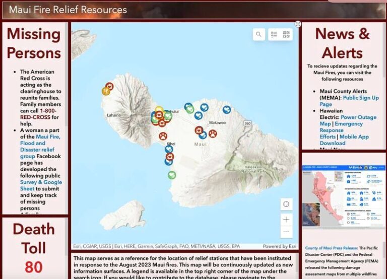 With Aquawolf’s support, Jenkins booked a flight home and remained in Hawai’i for five months. There, she collected information from news outlets, emergency notifications, social media, and various organizations’ websites, using ArcGIS Experience Builder to organize and disseminate that information into the publicly accessible Maui Fire Relief dashboard.