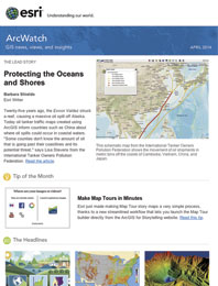 ITOPF uses Esri ArcGIS to create schematic maps that show how much oil is transported along any particular coastline and shipping route and publishes them on its website (see figure 1). Map data includes tanker and vessel types, tonnage, and the number of journeys. In addition, you can see a geographic history of major tanker oil spills since the 1970s (see figure 2). Adding data from the United Nations Environment Programme (UNEP) about the world protected areas to the map, along with tanker traffic over or near these areas, makes for a strong visualization.