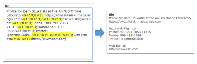 You can format your profile for easier reading by inserting carriage returns. While the profile editor does not currently support what you see is what you get (WYSIWIG) editing or HTML, you can add carriage returns and special characters by using HTML character codes. In the example below, carriage returns and line feeds (highlighted in yellow) were added to improve profile formatting.