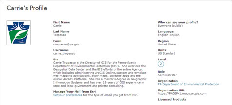 Your ArcGIS Online user profile is how your colleagues and peers in other organizations learn about you. Also, it’s a yardstick for measuring the value and veracity of your shared items and groups. Whether you’re making maps and apps for others in your GIS department, for users throughout your organization, or for the general public, it’s a good idea and a best practice to write and display a complete profile, especially if you want others to consider your content seriously.