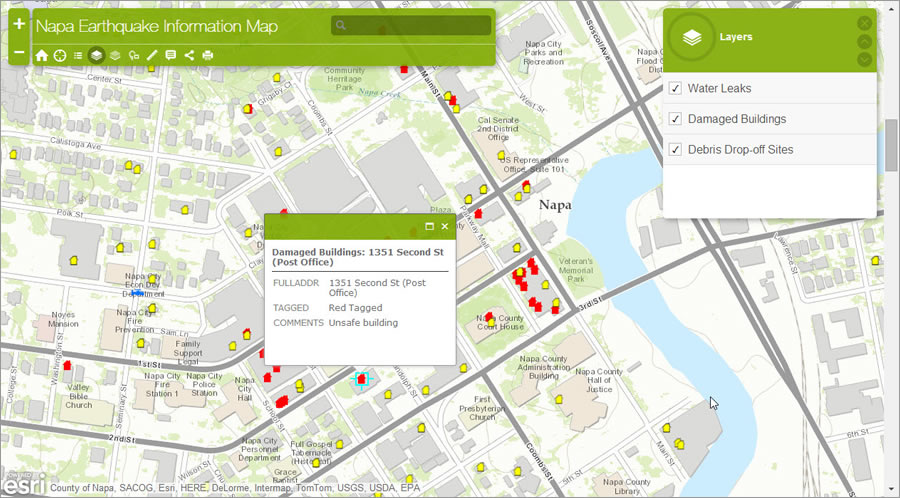 The City of Napa used Esri technology to keep the public updated about damaged buildings and other infrastructure after the 6.0 magnitude temblor struck on August 24, 2014, injuring more than 200 people, setting off fires, and knocking out power for tens of thousands of residents.