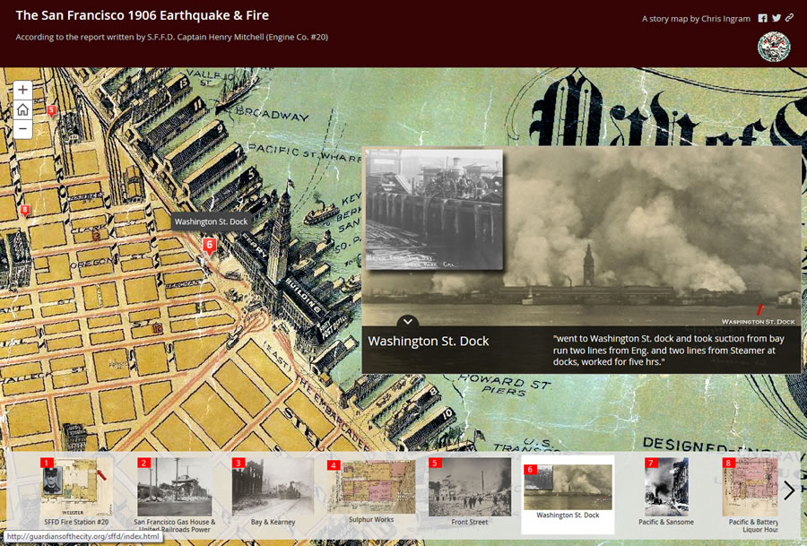 The San Francisco 1906 Earthquake and Fire interactive map, created using an Esri Story Map app, chronicles the tragedy. The app was authored by Chris Ingram from the Santa Clara County Fire Department, based in Los Gatos in California’s Bay Area. The map tells the story of the disaster through the words of Henry Mitchell, a captain in the San Francisco Fire Department at the time.