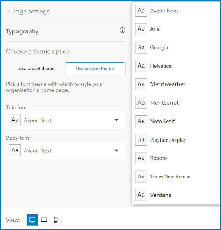 Select fonts for your home page by choosing Typography under DESIGN. Save time by selecting from four preset font themes, or create a custom theme by selecting your title font and body font from the 11 available fonts. All available fonts support text legibility requirements.