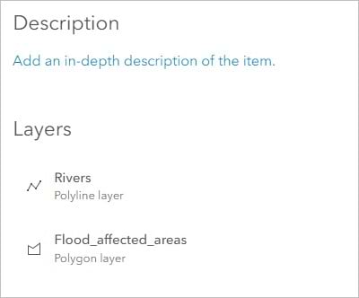 The item page of the new Nigeria Flood feature layer appears. It contains two sublayers that are listed under the Layers heading: Rivers and Flood_affected_areas.