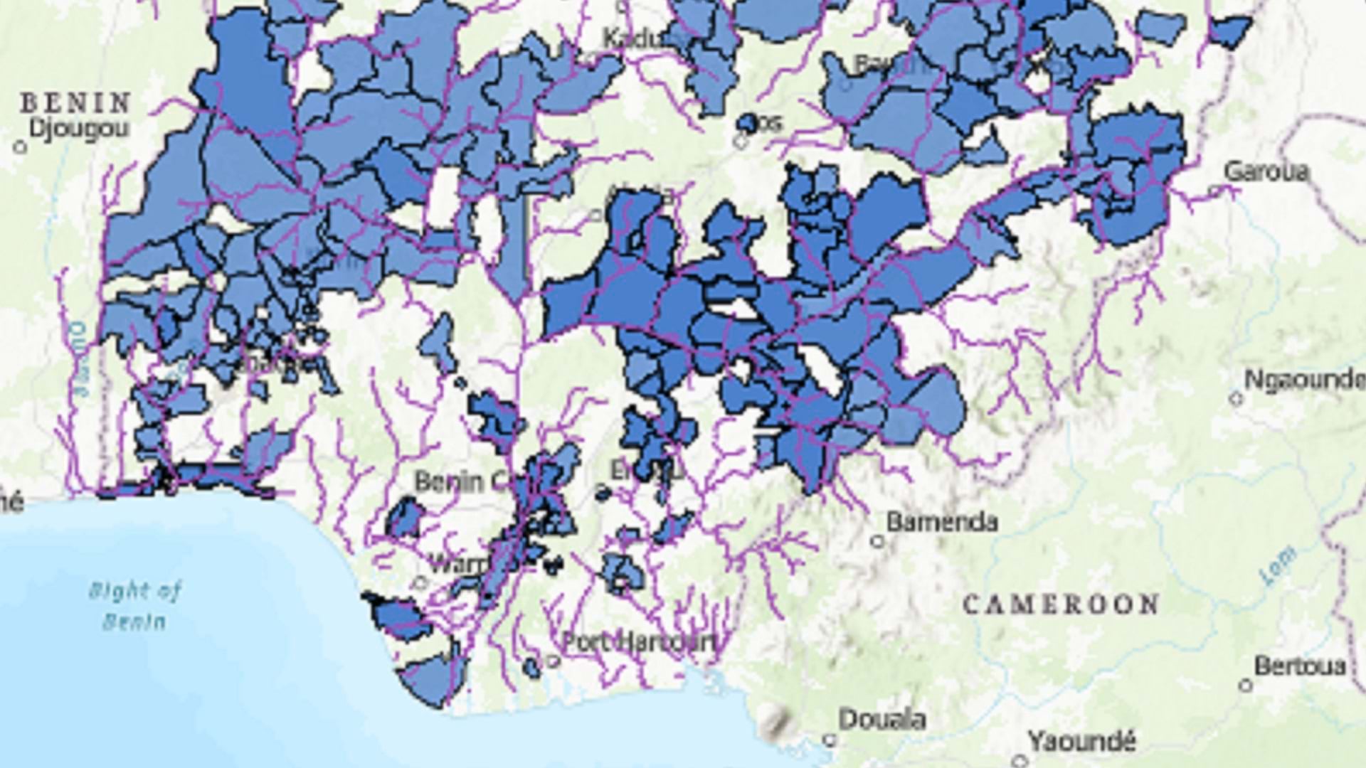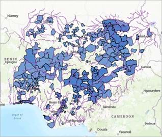 A map appears, zoomed to Nigeria. It contains lines representing rivers and polygons representing areas affected by flooding in 2022.