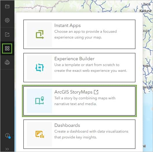 Several ArcGIS products allow you to build different kinds of apps. In this tutorial, you’ll share your map using ArcGIS StoryMaps because you plan to include a lot of text and images in addition to the map.