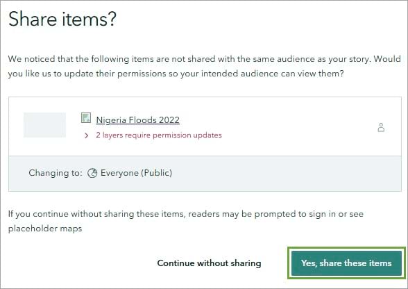 The Share items? page appears. It prompts you to update the permissions for the web map and layer. (It’s not enough to update the sharing level for the story; you must also update the sharing level for all items inside the story.) Click Yes, share these items.