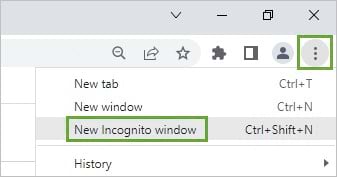 - In Google Chrome, click the menu button, then click New Incognito window.