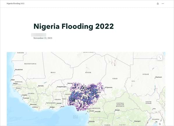 In this tutorial, which involves flooding in Nigeria, you’ll upload data to ArcGIS Online to create a web map with the data, and then create a story with the web map. You’ll publish and share the story and test that it can be viewed without an ArcGIS account. Finally, you’ll update permission settings so that all elements of the story are properly shared.