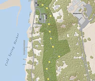 NYS OPRHP’s map of the trail, which displays markers 101 through 115 along with each sign’s coordinates, has been posted at a kiosk in Cold Spring Harbor State Park. Visitors can download a PDF of the map—with the trail marker numbers and coordinates on it—to their smartphones by scanning the map’s QR Code at the kiosk.