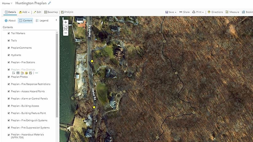 Genaway said the trail marker data was added as a feature layer to the Huntington Fire Preplan application, hosted via the town’s ArcGIS Online organizational account. The Huntington Fire Preplan app contains information about the town’s buildings (e.g., roof materials, known hazards, and floor plans), which helps firefighters plan their response to fires or other emergencies. The preplan and trail marker information also is available to local firefighters and first responders via the Explorer for ArcGIS mobile app.