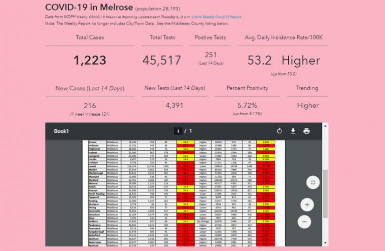On the Hub site, residents will find helpful resources such as the latest local and statewide data on COVID-19 cases; data on testing in Melrose, including the numbers of positive tests; maps that show confirmed and probable deaths from COVID-19, by county, throughout the state; and an interactive data dashboard from the Massachusetts Department of Public Health with information on numbers of cases, tests, hospitalizations, and deaths statewide. Also included are graphics that display the numbers of people tested statewide; links to COVID-19 testing sites; and videos from Melrose mayor Paul Brodeur, who provides updates such as news about contact tracing, testing, and vaccinations. Viewers will also find a symptom checker as well as a section that details the four-phase plan for reopening the state.