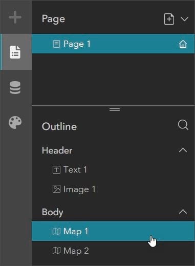 The template includes side-by-side Map widgets that contain a 2D web map and 3D web scene. Click each Map Widget on the screen or select each one from the page outline in the side panel to view their settings in the settings panel.