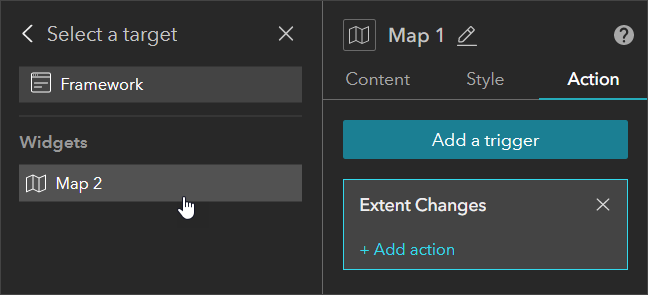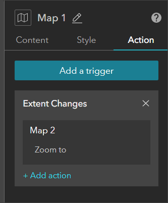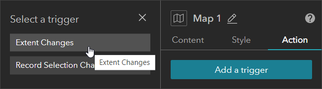 Step 6: You will use a change in the extent of Map 1 to trigger an action in Map 2. Click the Extent Changes trigger.