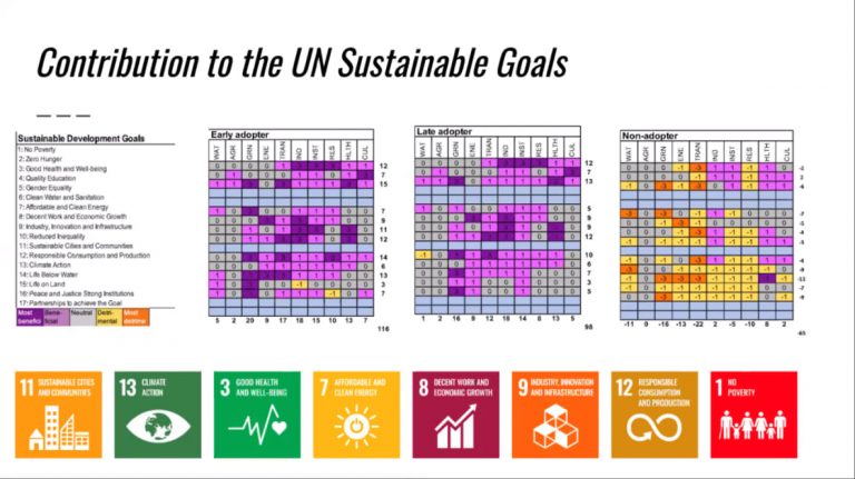 When these scenarios are visualized, the cumulative impact of implementing planning strategies sooner rather than later is highlighted. Students were also asked to estimate the impact on the United Nations (UN) Sustainable Development Goals in order to frame the problems or challenges they chose to study. The top five goals are to eliminate poverty, have zero hunger, foster good health and well-being, advance quality education, and achieve gender equality.