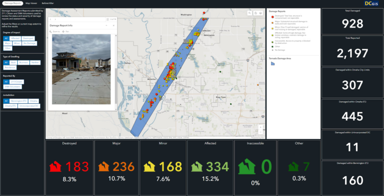 Schonlau’s department oversees core GIS services for the whole of Douglas County, which includes the city of Omaha. The department primarily provides GIS support to other departments and agencies, including managing multiple databases and over 100 web apps and mobile apps with ArcGIS tools. This infrastructure, as well as county employees’ familiarity with ArcGIS, is invaluable in emergency situations such as tornadoes and floods, when GIS is instrumental both in responding to a disaster and in recovery. During the recovery process, an accurate assessment of damage is crucial in ensuring that local government receives reimbursement from the Federal Emergency Management Agency (FEMA) for recovery efforts in the aftermath of an emergency event such as a tornado.