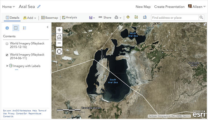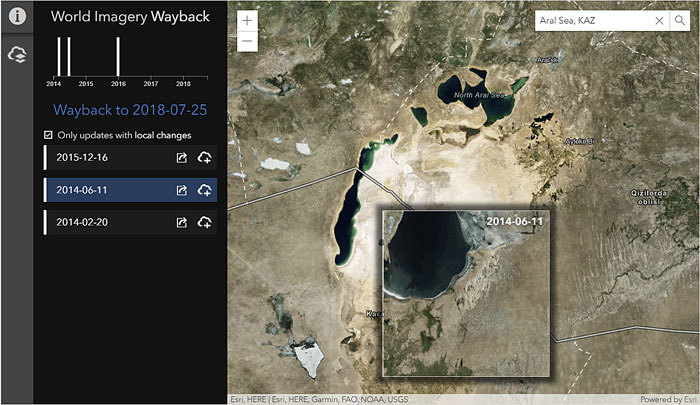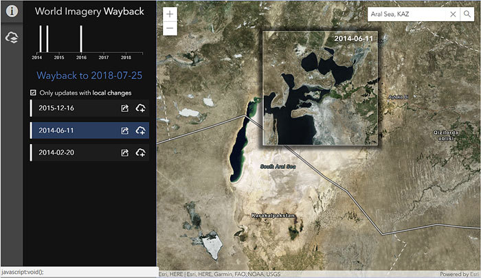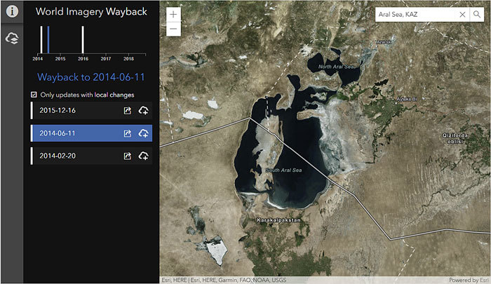 In this tip, you will learn how to use World Imagery Wayback to explore changes in the Aral Sea, once the fourth largest lake in the world. Using archived imagery, you will be able to see how the lake has diminished in size due to water diversion projects aimed at transforming deserts in Kazakhstan, Uzbekistan, and Turkmenistan into farms.