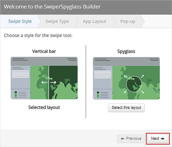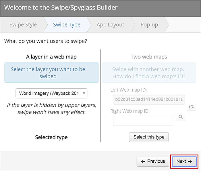 - Click Next, since the option to swipe layers in a web map is automatically selected.
