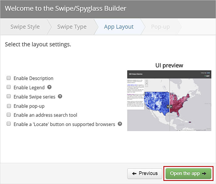 - Choose the layout settings for the web app. In this example, the layout settings are unchecked to create a very simple app. Once you have configured the settings, click Open the app.