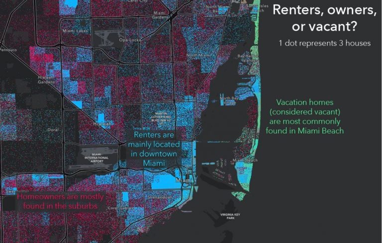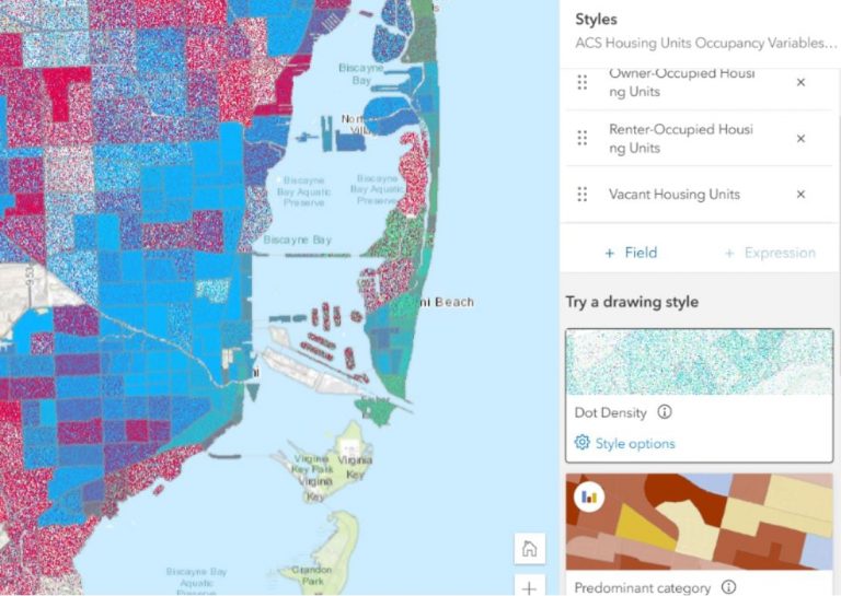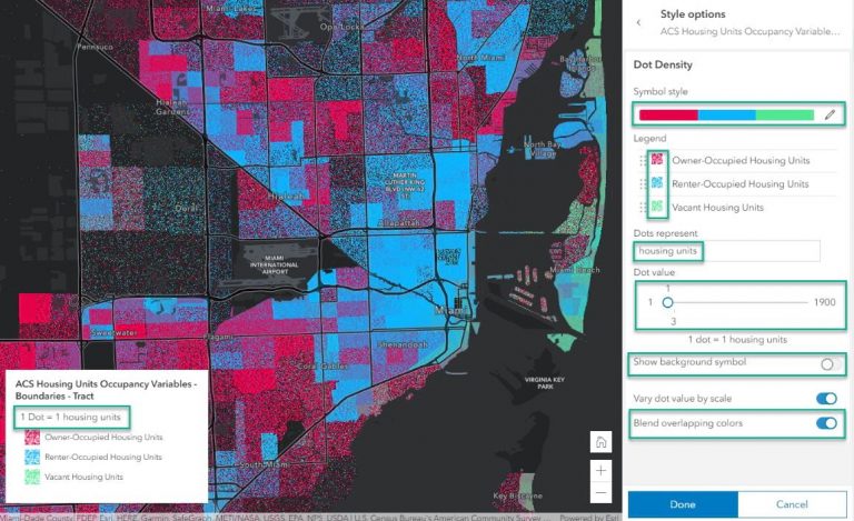 In this tip, you will create a map called Renters, Owners, or Vacant? for the city of Miami, Florida, that shows housing type patterns throughout the community. The map answers the question of which housing unit type is most common in each area of the city. On this map, every dot represents three houses. The red dots represent occupant-owned units, the blue dots represent rentals, and the green dots represent vacant units.