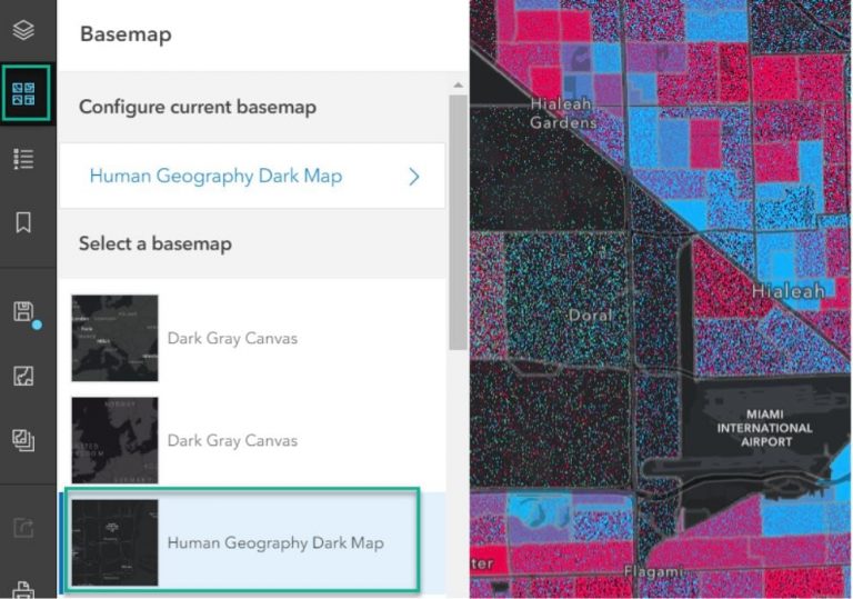 f. Use a dark background to let dot density look its best. Click the basemap button on the top left side of the page and choose a dark gray basemap. In this case, select Human Geography Dark Map. If you do not see the Human Geography Dark Map in your basemap gallery, choose Dark Gray Canvas. Close the Basemap panel.