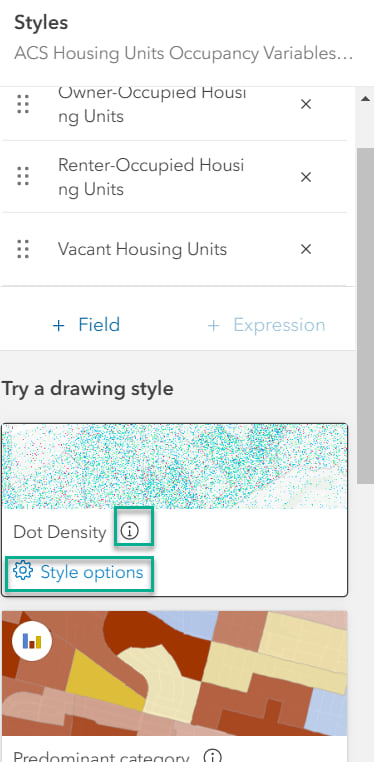 g. Point to the right side of the page on the Styles panel, then click the info button (see image below) on the Dot Density card to read more about this map style. Next, click Style options.