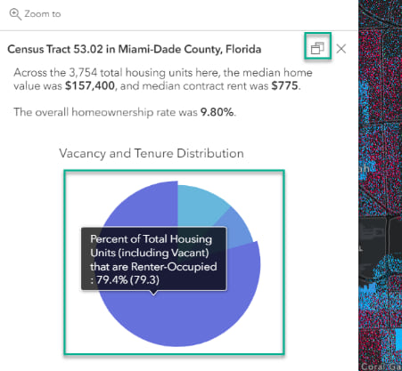 i. Click on the map to view the pop-up. The pie chart shows the count of rented, owner-occupied, and vacant housing units. Areas in the map that have a purple tint are places where there are an even number of owner- and renter-occupied housing units (owners/red + renters/blue = even number of owners and renters/purple). You can dock the pop-up by clicking the Dock button on the upper right-hand side of the pop-up.