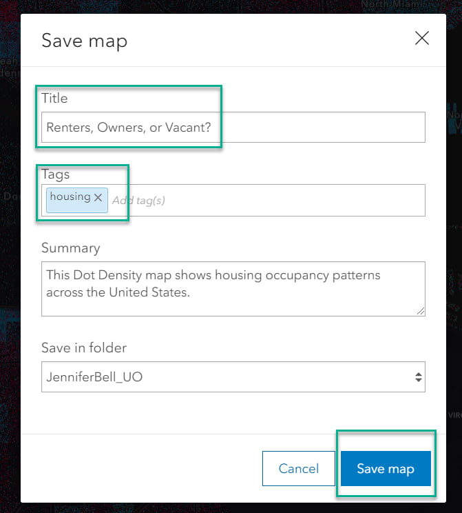 b. Give your map a title by typing “Renters, Owners, or Vacant” and give it one or more tags. Click Save Map.