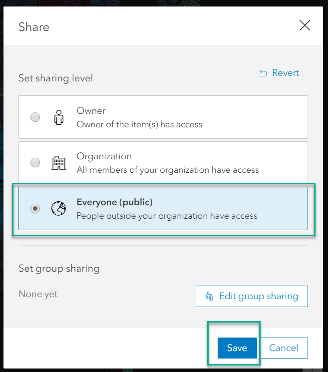 c. Click the Share button. You can choose to share the map with your organization, or (as shown below) click Everyone (public).